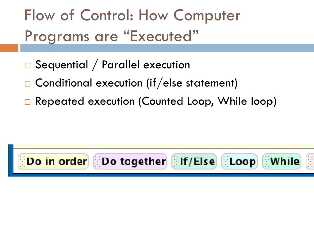 Flow of Control: How Computer Programs are “Executed” • Sequential / Parallel execution • Conditional execution (if/else statement) • Repeated execution (Counted Loop, While loop)