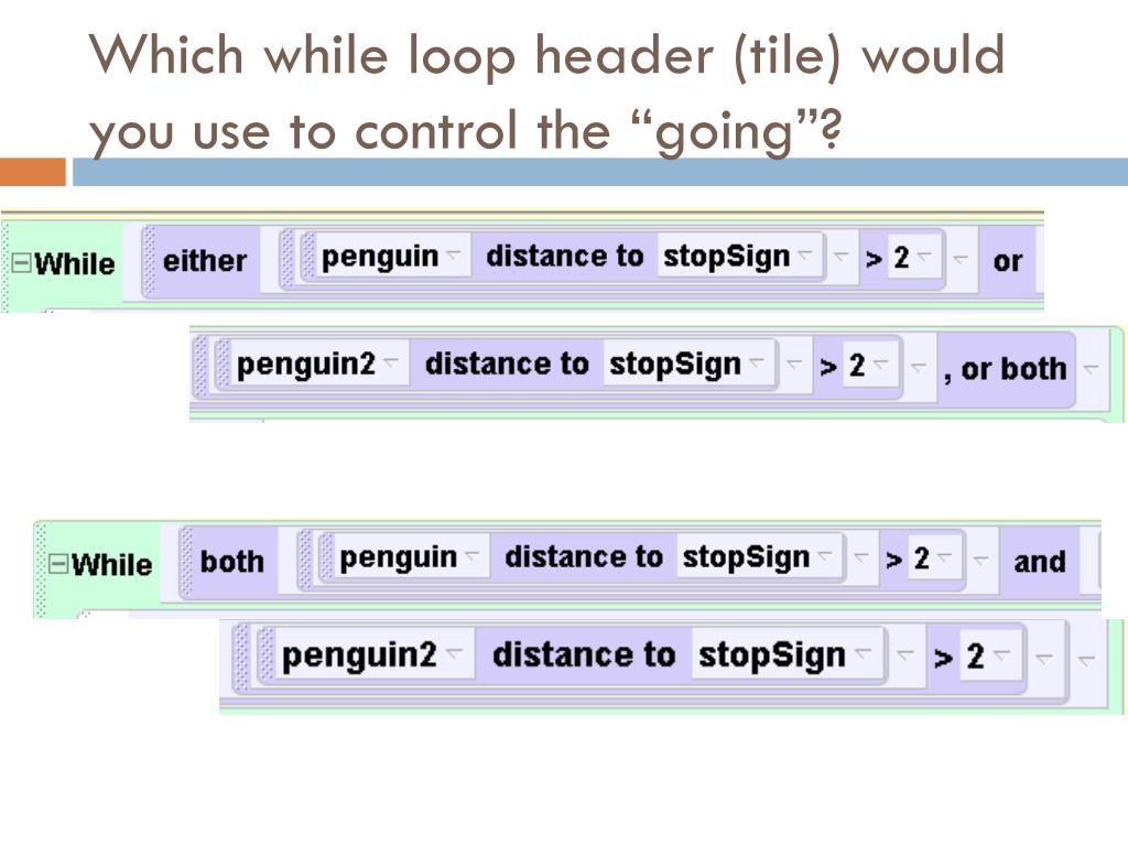 What does the other one do? This would STOP the game (evaluate to false) when • Both penguins must be close to the stop sign • Either penguin is close to the stop sign • Neither penguin is close to the stop sign • I don’t know