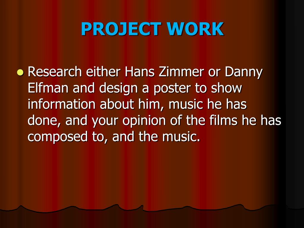 PROJECT WORK • Research either Hans Zimmer or Danny Elfman and design a poster to show information about him, music he has done, and your opinion of the films he has composed to, and the music.