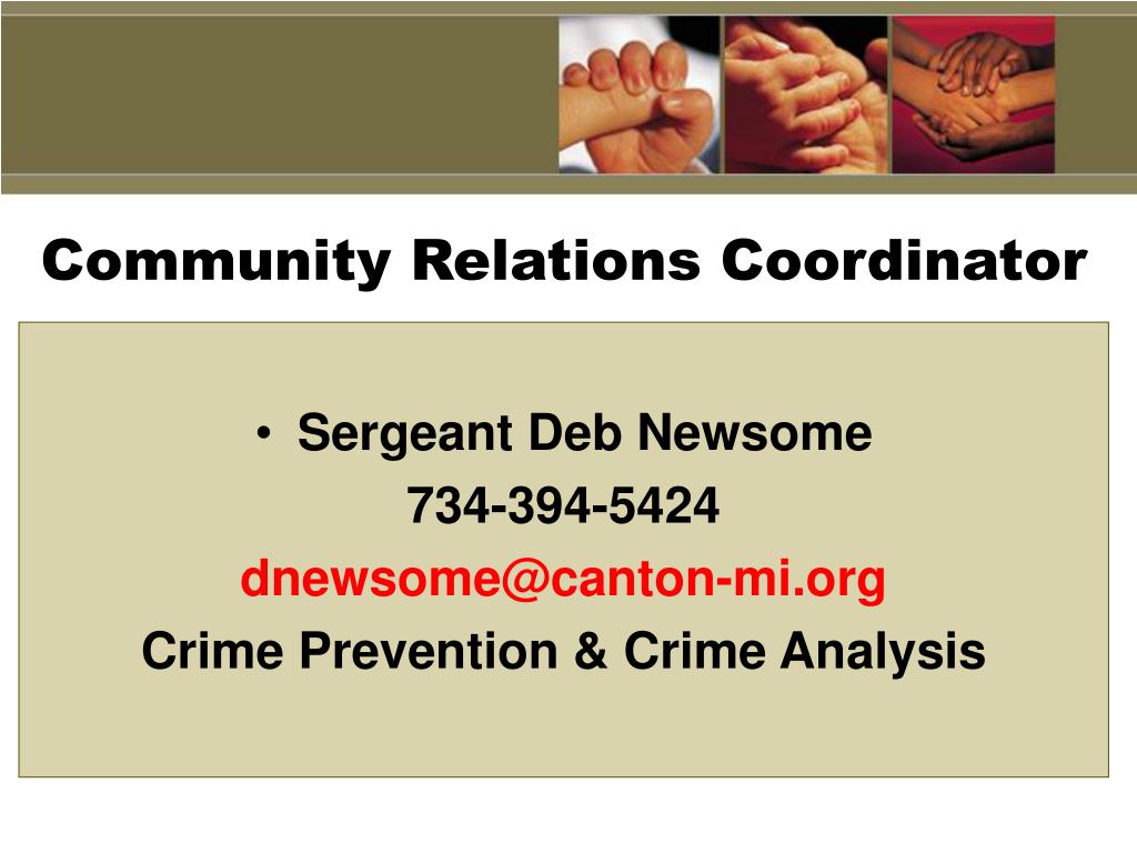 Community Relations Coordinator • Sergeant Deb Newsome 734-394-5424 dnewsome@canton-mi.org Crime Prevention & Crime Analysis