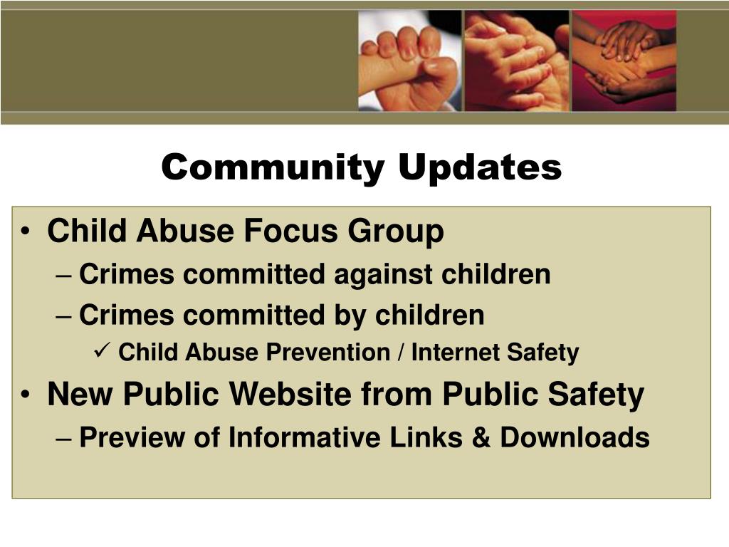 Community Updates • Child Abuse Focus Group • Crimes committed against children • Crimes committed by children • Child Abuse Prevention / Internet Safety • New Public Website from Public Safety • Preview of Informative Links & Downloads