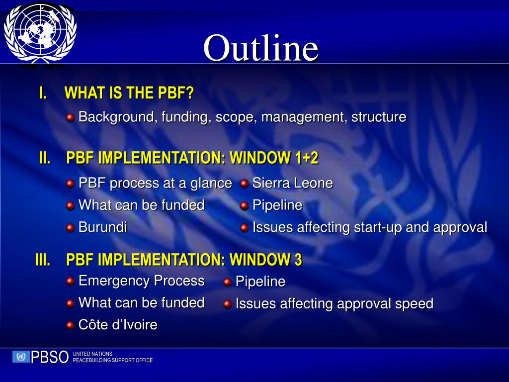 UNITED NATIONS Peacebuilding Support Office. United Nations PEACEBUILDING FUND. Bridging the Gap Between Conflict & Recovery. A Presentation to the DGO Transition Workshop 3 – 6 March 2008. WHAT IS THE PBF?. Background, funding, scope, management, structure.