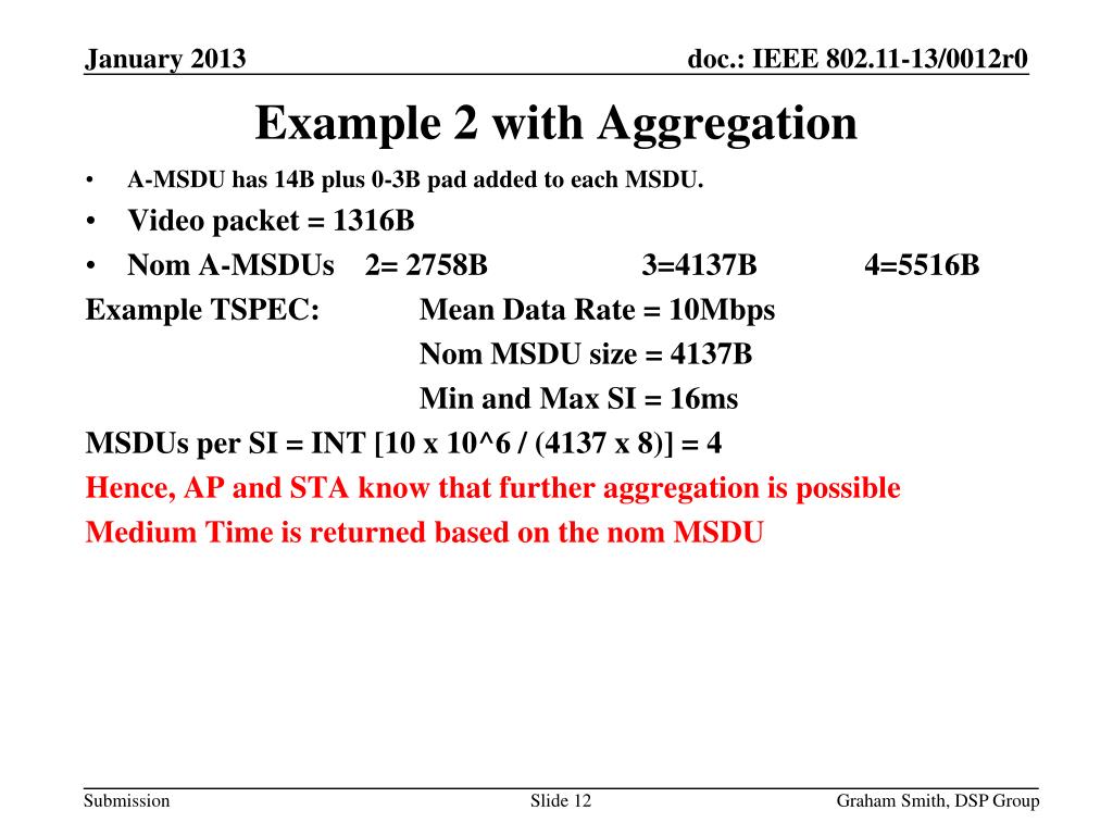 Example 2 with Aggregation • A-MSDU has 14B plus 0-3B pad added to each MSDU. • Video packet = 1316B • Nom A-MSDUs 2= 2758B 3=4137B 4=5516B Example TSPEC: Mean Data Rate = 10Mbps Nom MSDU size = 4137B Min and Max SI = 16ms MSDUs per SI = INT [10 x 10^6 / (4137 x 8)] = 4 Hence, AP and STA know that further aggregation is possible Medium Time is returned based on the nom MSDU Graham Smith, DSP Group