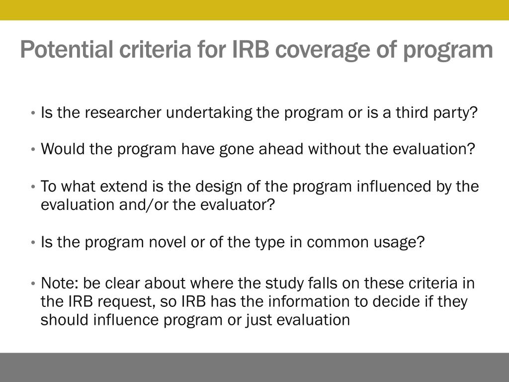Potential criteria for IRB coverage of program • Is the researcher undertaking the program or is a third party? • Would the program have gone ahead without the evaluation? • To what extend is the design of the program influenced by the evaluation and/or the evaluator? • Is the program novel or of the type in common usage? • Note: be clear about where the study falls on these criteria in the IRB request, so IRB has the information to decide if they should influence program or just evaluation