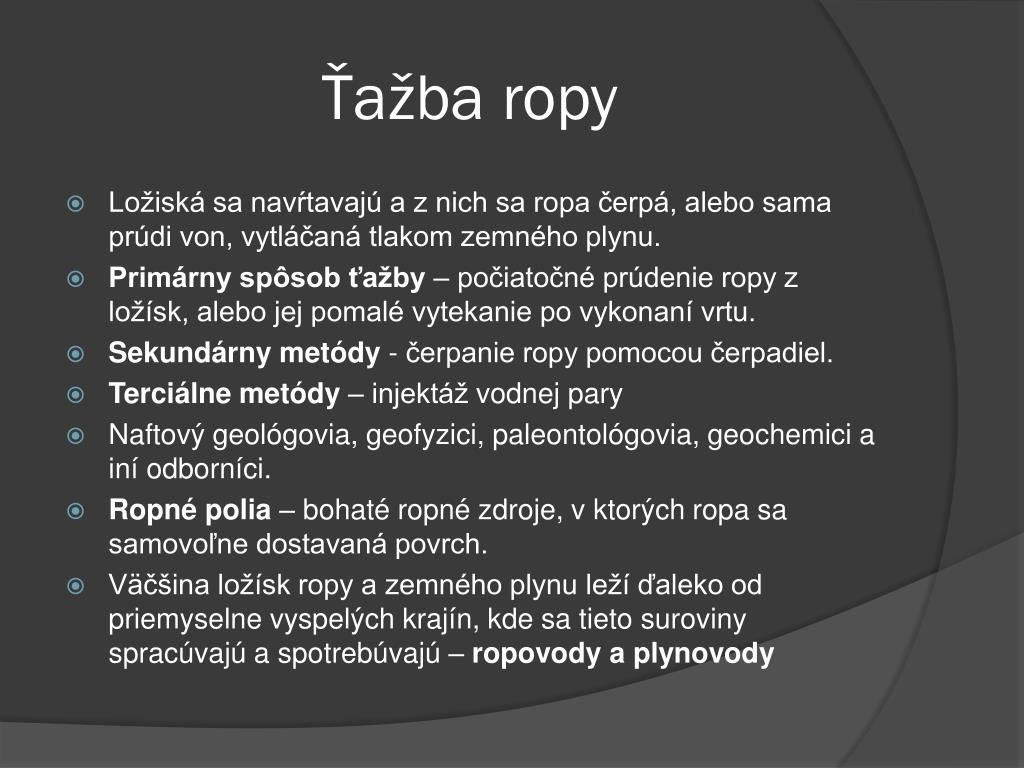 Ropa ako ju poznáme • Známy pod pojmom „Čierne zlato“ • Rafinovaný zdroj energie • „Potrava“ pre auto a jej neustále rastúce ceny • Horľavá kvapalina • Dôležitá nerastná surovina s jej významnou ekonomickou komoditou