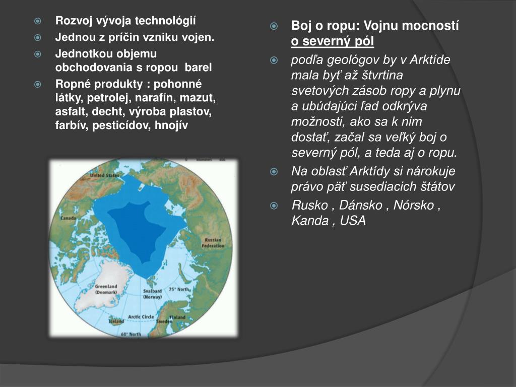 Rozvoj vývoja technológií • Jednou z príčin vzniku vojen. • Jednotkou objemu obchodovania s ropou barel • Ropné produkty : pohonné látky, petrolej, narafín, mazut, asfalt, decht, výroba plastov, farbív, pesticídov, hnojív • Boj o ropu: Vojnu mocností o severný pól • podľa geológov by v Arktíde mala byť až štvrtina svetových zásob ropy a plynu a ubúdajúci ľad odkrýva možnosti, ako sa k nim dostať, začal sa veľký boj o severný pól, a teda aj o ropu. • Na oblasť Arktídy si nárokuje právo päť susediacich štátov • Rusko , Dánsko , Nórsko , Kanda , USA