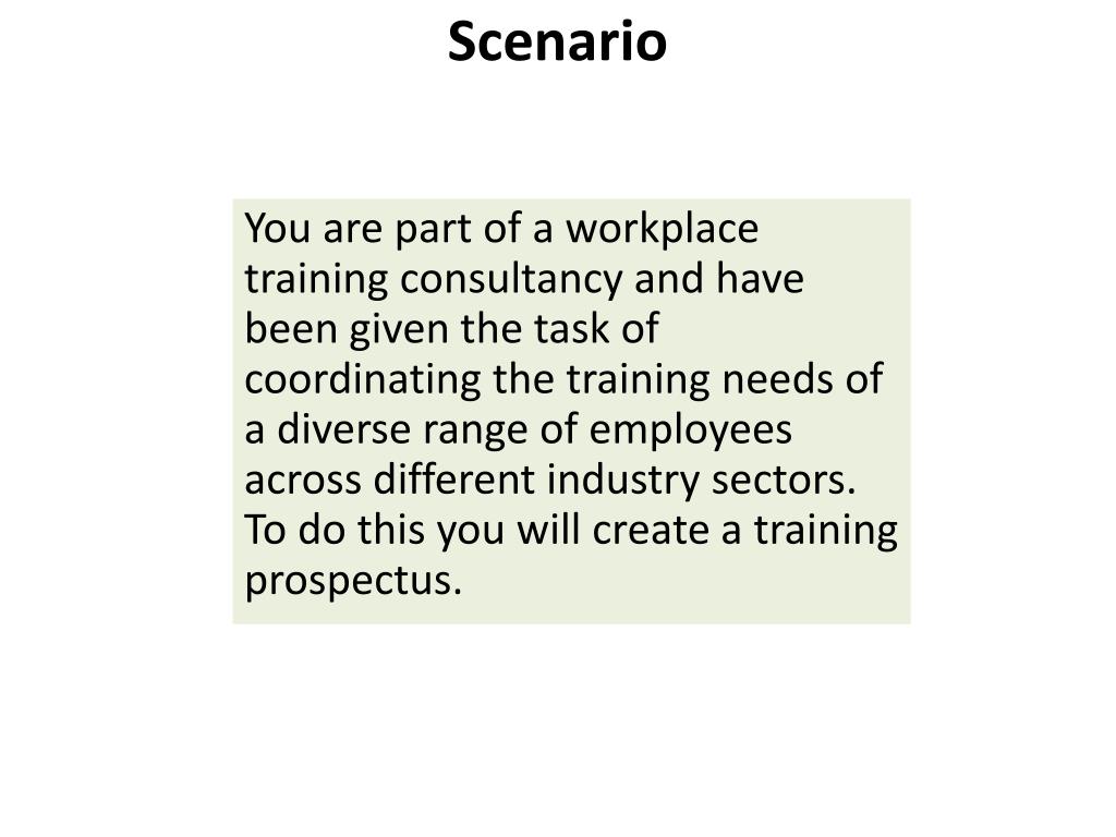 Training in the Workplace Assignment 2. November 2013. Scenario. You are part of a workplace training consultancy and have been given the task of coordinating the training needs of a diverse range of employees across different industry sectors. To do this you will create a training prospectus.