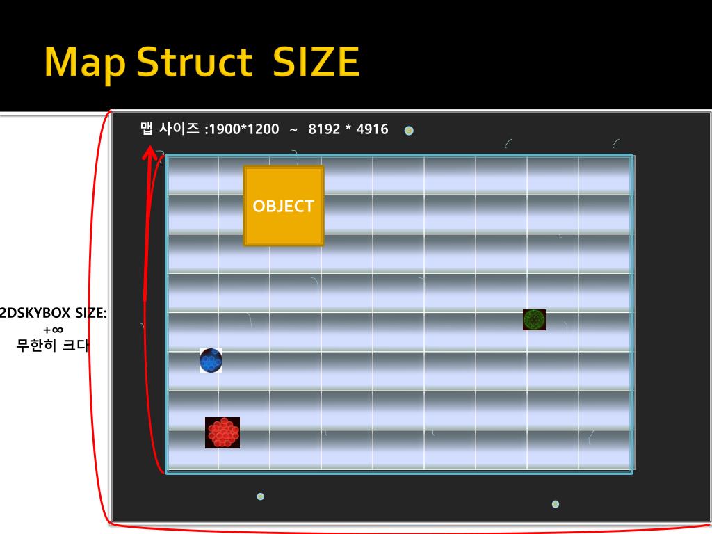 Map Struct SIZE 맵 사이즈 :1900*1200~ 8192 * 4916 OBJECT 2DSKYBOX SIZE: +∞ 무한히 크다