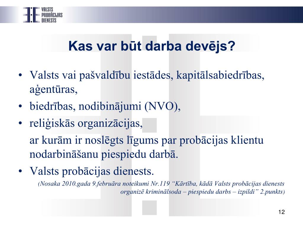 Kas var būt darba devējs? • Valsts vai pašvaldību iestādes, kapitālsabiedrības, aģentūras, • biedrības, nodibinājumi (NVO), • reliģiskās organizācijas, ar kurām ir noslēgts līgums par probācijas klientu nodarbināšanu piespiedu darbā. • Valsts probācijas dienests. (Nosaka 2010.gada 9.februāra noteikumi Nr.119 “Kārtība, kādā Valsts probācijas dienests organizē kriminālsoda – piespiedu darbs – izpildi” 2.punkts)