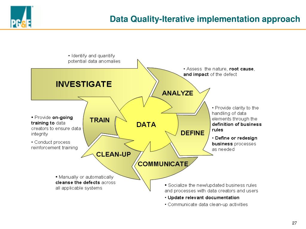 Foundational Phase Enterprise Data Quality • Data quality is an assessment of fitness of the data to serve its purpose in a given context. Aspects of Data Quality include • Accuracy • Completeness • Timeliness • Relevance • Reliability • Viability of business decisions are contingent on good data... • Good data is contingent on an effective approach to Data Quality • Management