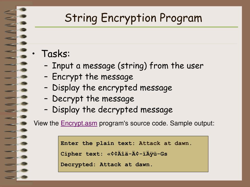 String Encryption Program • Tasks: • Input a message (string) from the user • Encrypt the message • Display the encrypted message • Decrypt the message • Display the decrypted message View the Encrypt.asm program's source code. Sample output: Enter the plain text: Attack at dawn. Cipher text:«¢¢Äîä-Ä¢-ïÄÿü-Gs Decrypted: Attack at dawn.
