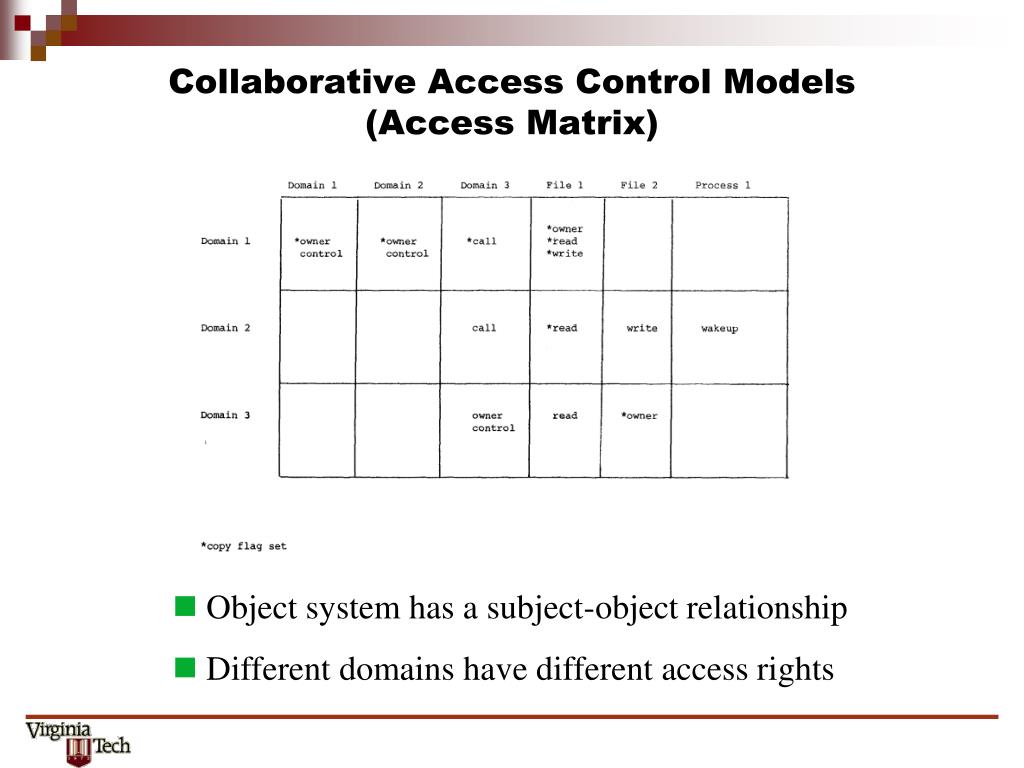 Collaborative Access Control Models(Access Matrix) • Object system has a subject-object relationship • Different domains have different access rights