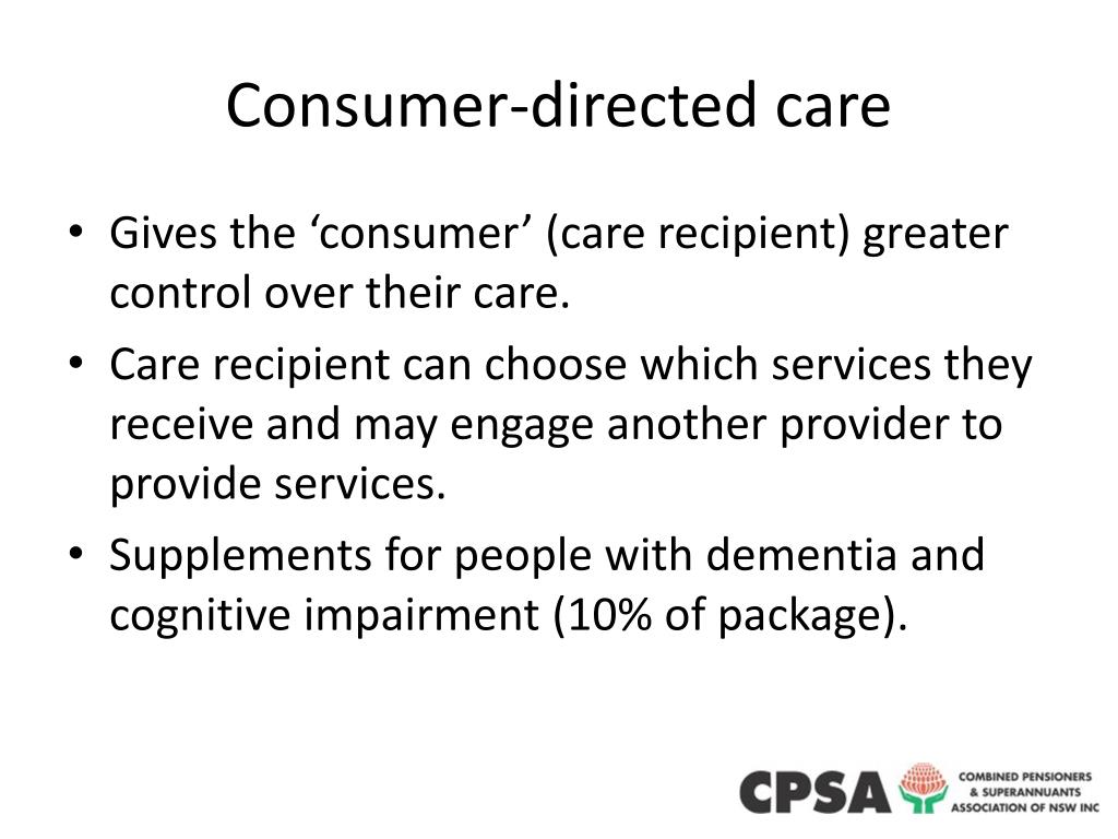 Consumer-directed care • Gives the ‘consumer’ (care recipient) greater control over their care. • Care recipient can choose which services they receive and may engage another provider to provide services. • Supplements for people with dementia and cognitive impairment (10% of package).