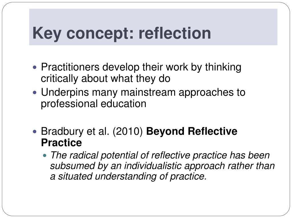 Key concept: reflection • Practitioners develop their work by thinking critically about what they do • Underpins many mainstream approaches to professional education • Bradbury et al. (2010) Beyond Reflective Practice • The radical potential of reflective practice has been subsumed by an individualistic approach rather than a situated understanding of practice.