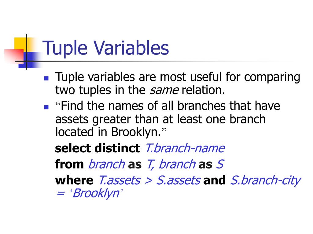 Tuple Variables • Tuple variables are most useful for comparing two tuples in the same relation. • “Find the names of all branches that have assets greater than at least one branch located in Brooklyn.” select distinctT.branch-name from branch as T, branch as S whereT.assets > S.assetsandS.branch-city = ‘Brooklyn’