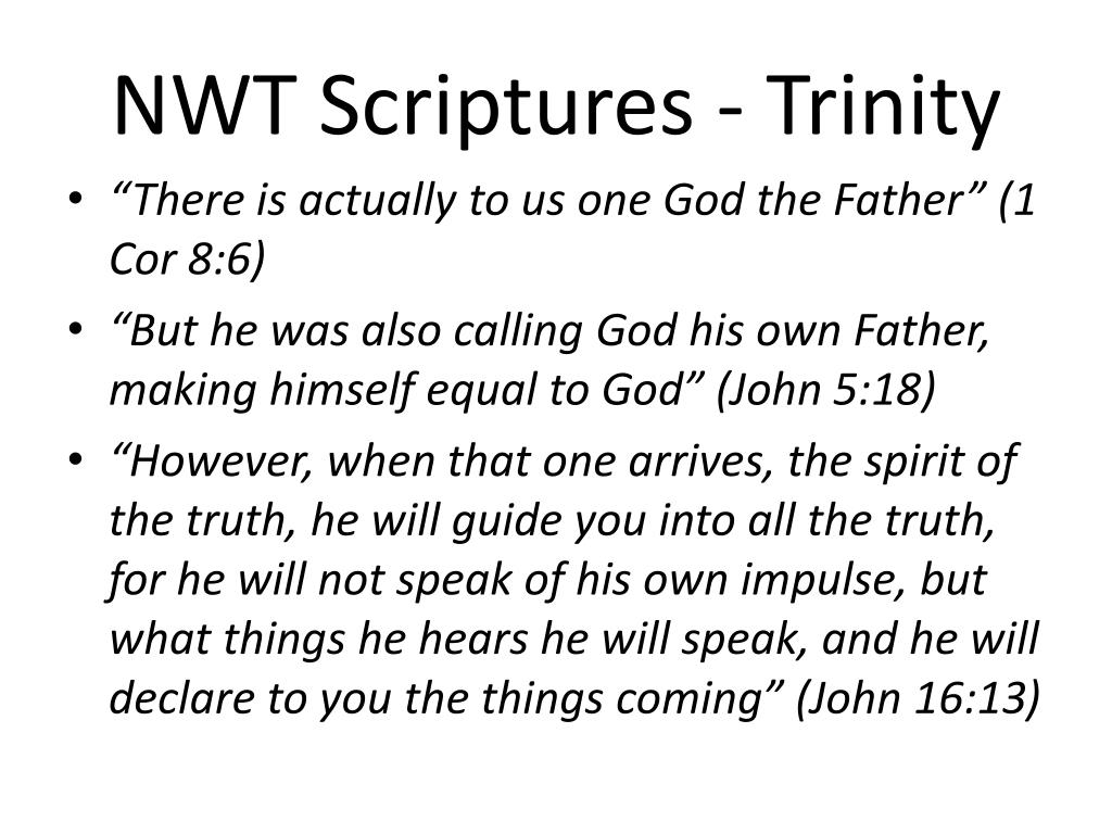 NWT Scriptures - Trinity • “There is actually to us one God the Father” (1 Cor 8:6) • “But he was also calling God his own Father, making himself equal to God” (John 5:18) • “However, when that one arrives, the spirit of the truth, he will guide you into all the truth, for he will not speak of his own impulse, but what things he hears he will speak, and he will declare to you the things coming” (John 16:13)