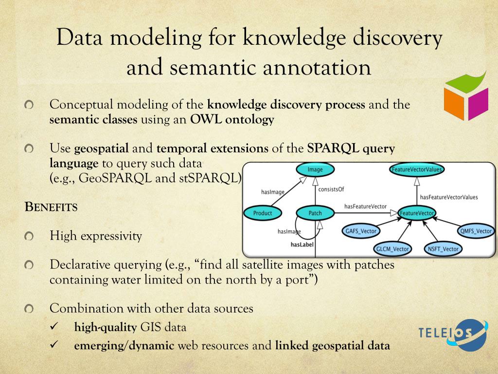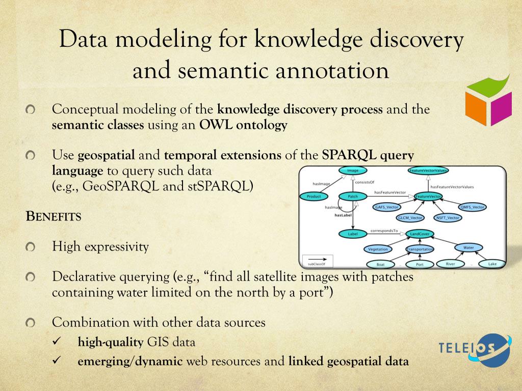 Data modeling for knowledge discovery and semantic annotation • Conceptual modeling of the knowledge discovery process and the semantic classes using an OWL ontology • Use geospatial and temporal extensions of the SPARQL query language to query such data(e.g., GeoSPARQL and stSPARQL) Benefits • High expressivity • Declarative querying (e.g., “find all satellite images with patches containing water limited on the north by a port”) • Combination with other data sources • high-quality GIS data • emerging/dynamic web resources and linked geospatial data