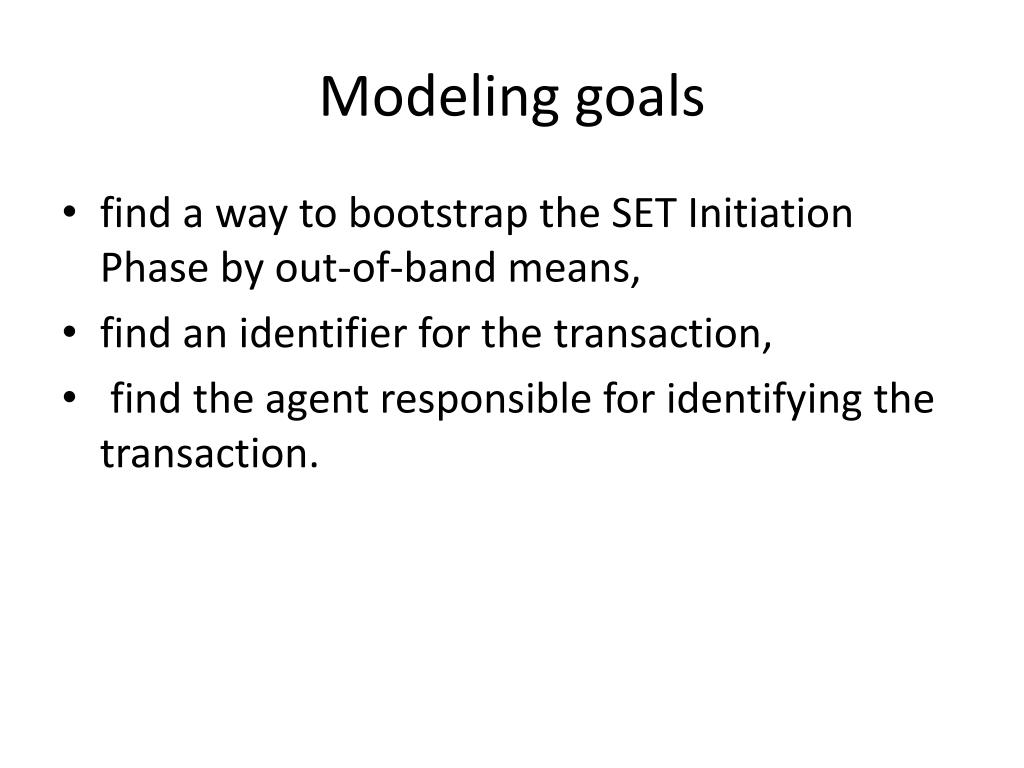 Modeling goals • find a way to bootstrap the SET Initiation Phase by out-of-band means, • find an identifier for the transaction, • find the agent responsible for identifying the transaction.