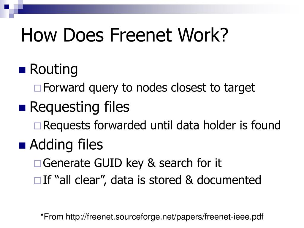 How Does Freenet Work? • Routing • Forward query to nodes closest to target • Requesting files • Requests forwarded until data holder is found • Adding files • Generate GUID key & search for it • If “all clear”, data is stored & documented *From http://freenet.sourceforge.net/papers/freenet-ieee.pdf