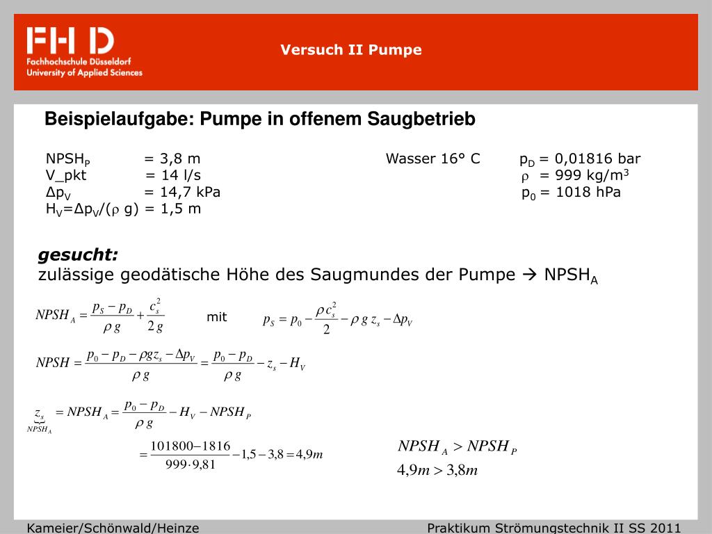 Beispielaufgabe: Pumpe in offenem Saugbetrieb NPSHP = 3,8 m Wasser 16° C pD = 0,01816 bar V_pkt = 14 l/s = 999 kg/m3 ∆pV = 14,7 kPa p0 = 1018 hPa HV=∆pV/( g) = 1,5 m gesucht: zulässige geodätische Höhe des Saugmundes der Pumpe NPSHA mit