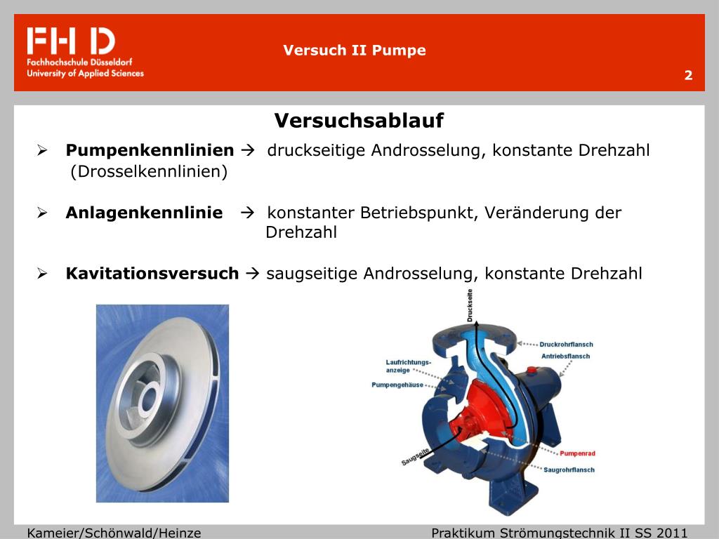 Klassifizierung von Pumpen. Versuchsablauf. 2. Pumpenkennlinien druckseitige Androsselung, konstante Drehzahl (Drosselkennlinien) Anlagenkennlinie konstanter Betriebspunkt, Veränderung der Drehzahl Kavitationsversuch saugseitige Androsselung, konstante Drehzahl.