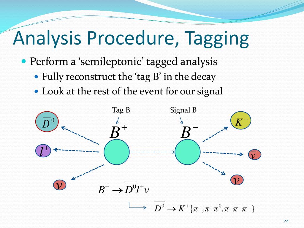 Analysis Procedure, Tagging • Perform a ‘semileptonic’ tagged analysis • Fully reconstruct the ‘tag B’ in the decay • Look at the rest of the event for our signal Tag B Signal B