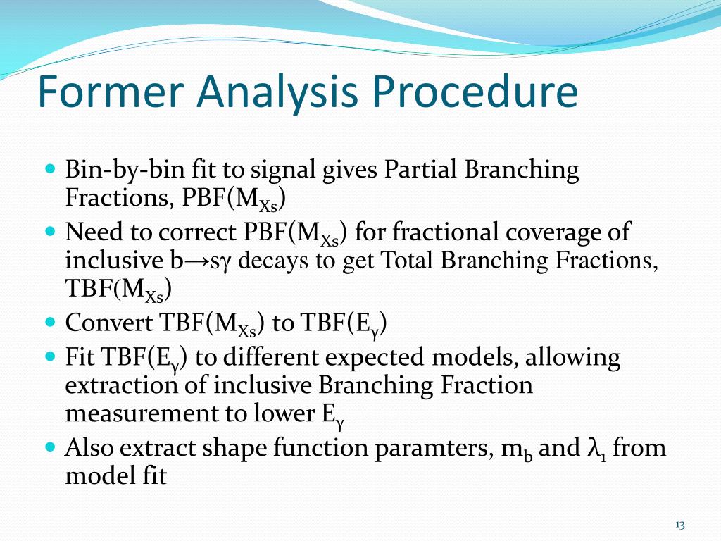 Former Analysis Procedure • Bin-by-bin fit to signal gives Partial Branching Fractions, PBF(MXs) • Need to correct PBF(MXs) for fractional coverage of inclusive b→sγ decays to get Total Branching Fractions, TBF(MXs) • Convert TBF(MXs) to TBF(Eγ) • Fit TBF(Eγ) to different expected models, allowing extraction of inclusive Branching Fraction measurement to lower Eγ • Also extract shape function paramters, mb and λ1 from model fit