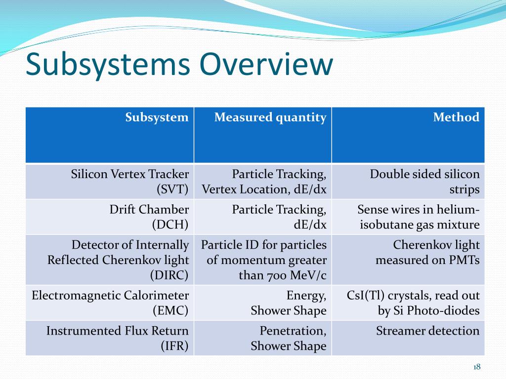 SVT and DCH SVT DCH • SVT • 5 layers of double-sided silicon strip sensors • φ measuring strips parallel to the beam, z measuring strips perpendicular to the beam • 20-40 μm resolution in all 5 layers. • DCH • 7,104 small drift cells arranged in 40 cylindrical layers • dE/dx measured by total charge deposited in each cell Source Babar doc