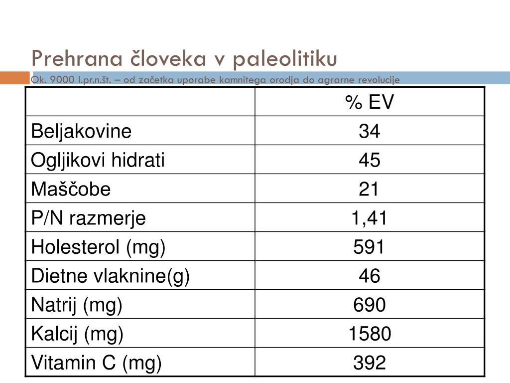 Prehrana človeka v paleolitikuOk. 9000 l.pr.n.št. – od začetka uporabe kamnitega orodja do agrarne revolucije