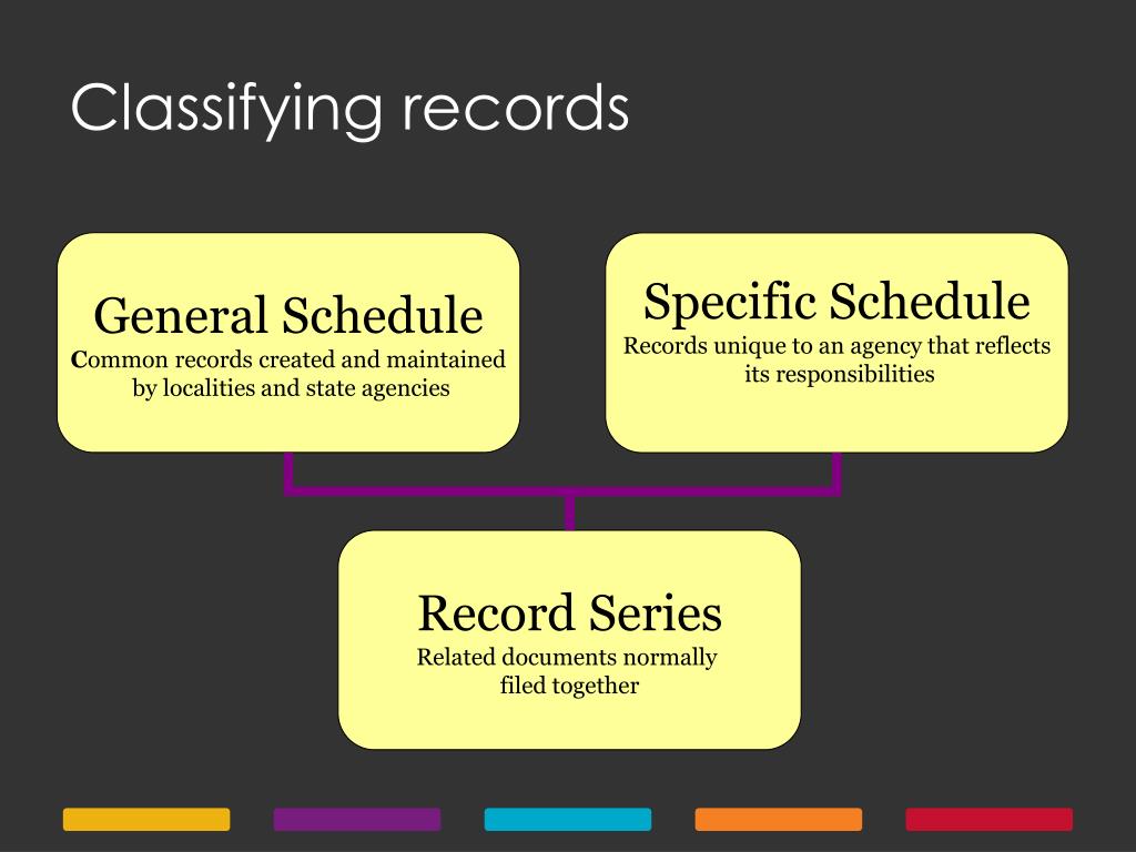 Classifying records General Schedule Common records created and maintained by localities and state agencies Specific Schedule Records unique to an agency that reflects its responsibilities Record Series Related documents normally filed together