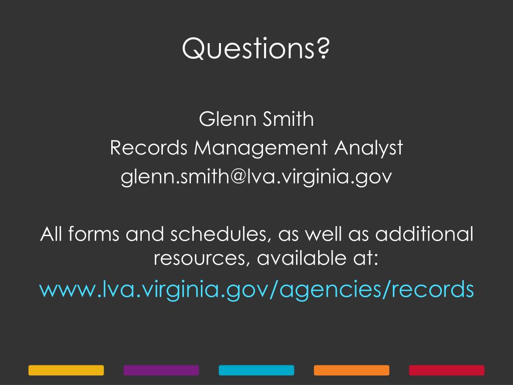 Questions? Glenn Smith Records Management Analyst glenn.smith@lva.virginia.gov All forms and schedules, as well as additional resources, available at: www.lva.virginia.gov/agencies/records