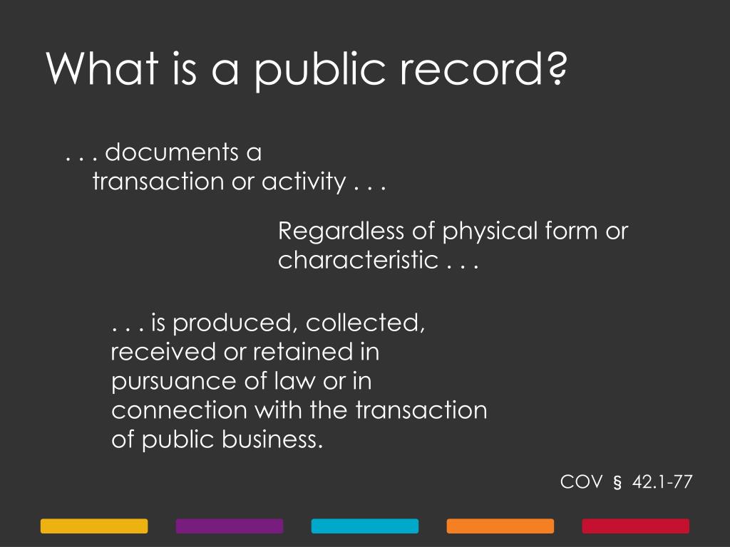 What is a public record? . . . documents a transaction or activity . . . Regardless of physical form or characteristic . . . . . . is produced, collected, received or retained in pursuance of law or in connection with the transaction of public business. COV § 42.1-77