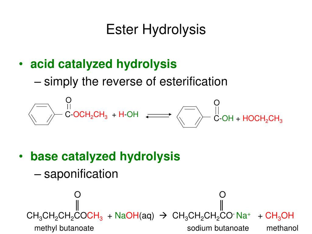 Ester Hydrolysis • acid catalyzed hydrolysis • simply the reverse of esterification • base catalyzed hydrolysis • saponification O O C-OCH2CH3 + H-OH C-OH + HOCH2CH3 O O ║ ║ CH3CH2CH2COCH3 + NaOH(aq) CH3CH2CH2CO- Na+ + CH3OH methyl butanoate sodium butanoate methanol