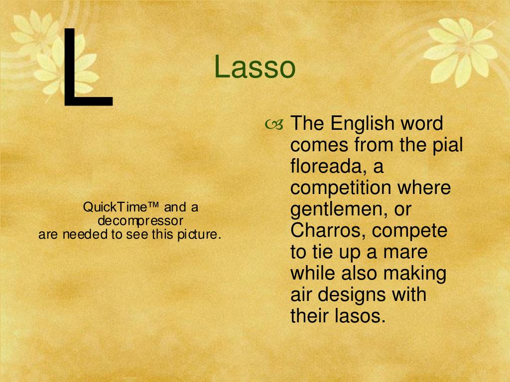 L Lasso • The English word comes from the pial floreada, a competition where gentlemen, or Charros, compete to tie up a mare while also making air designs with their lasos.