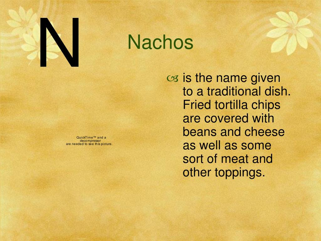 N Nachos • is the name given to a traditional dish. Fried tortilla chips are covered with beans and cheese as well as some sort of meat and other toppings.