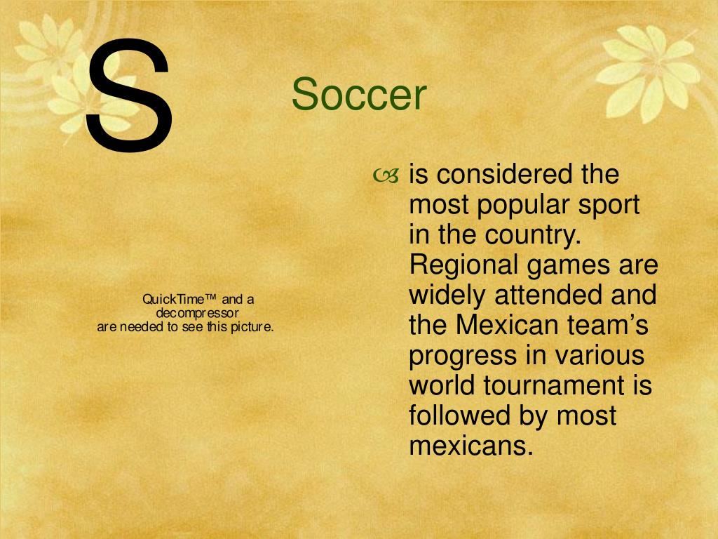 S Soccer • is considered the most popular sport in the country. Regional games are widely attended and the Mexican team’s progress in various world tournament is followed by most mexicans.