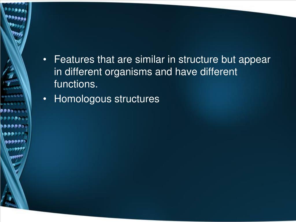 Features that are similar in structure but appear in different organisms and have different functions. • Homologous structures