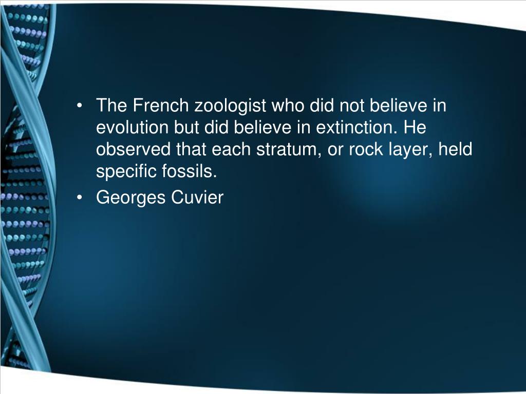 The French zoologist who did not believe in evolution but did believe in extinction. He observed that each stratum, or rock layer, held specific fossils. • Georges Cuvier