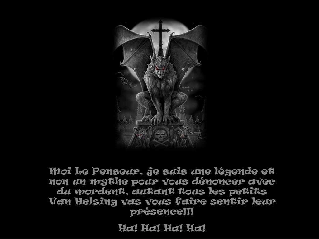 Moi Le Penseur, je suis une légende et non un mythe pour vous dénoncer avec du mordent, autant tous les petits Van Helsing vas vous faire sentir leur présence!!! Ha! Ha! Ha! Ha!