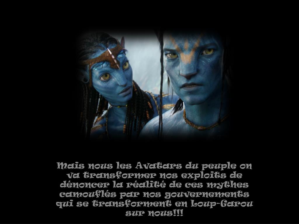Mais nous les Avatars du peuple on va transformer nos exploits de dénoncer la réalité de ces mythes camouflés par nos gouvernements qui se transforment en Loup-Garou sur nous!!!