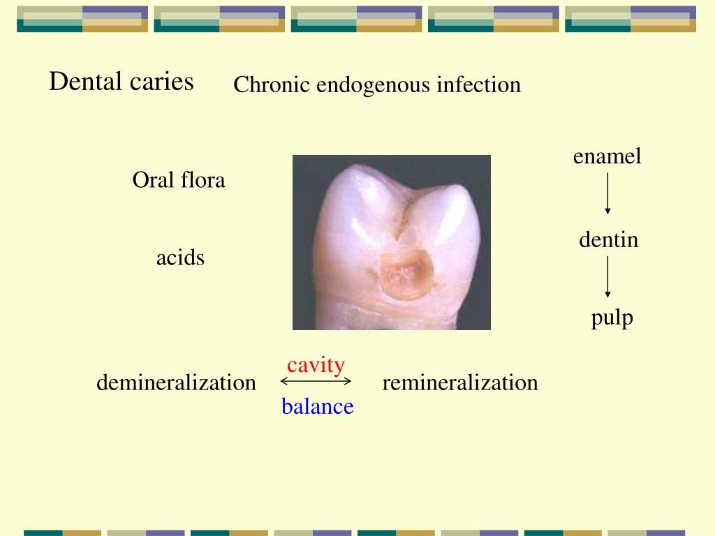Dental caries Chronic endogenous infection enamel Oral flora dentin acids pulp cavity demineralization remineralization balance
