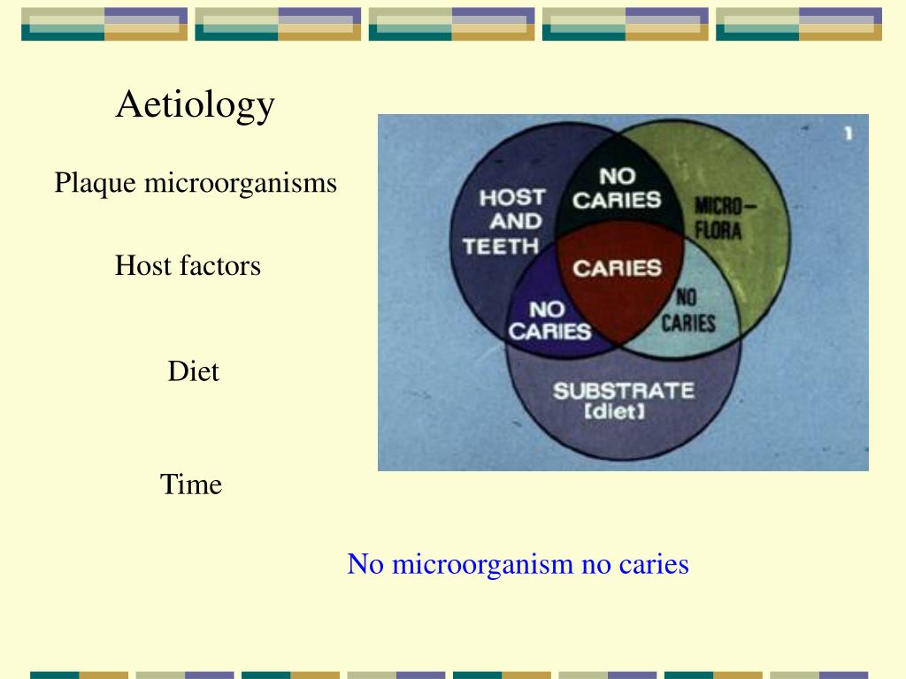 Aetiology Plaque microorganisms Host factors Diet Time No microorganism no caries