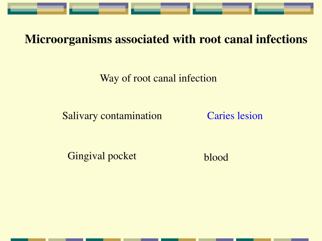 Microorganisms associated with root canal infections Way of root canal infection Salivary contamination Caries lesion Gingival pocket blood