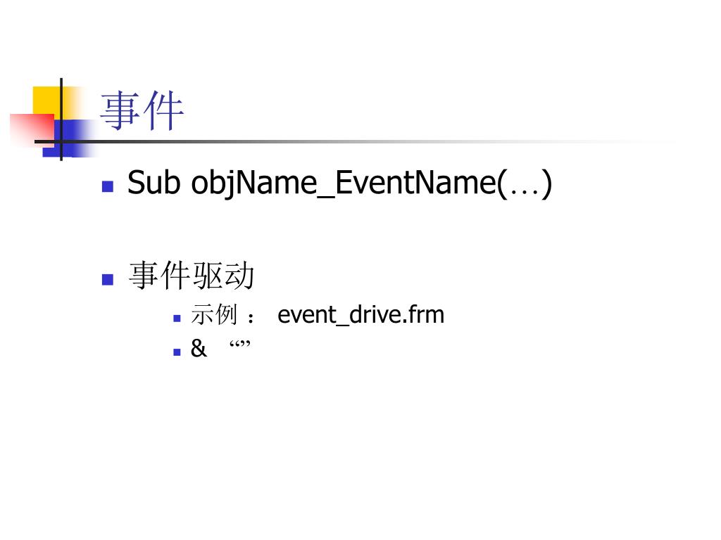 事件 • Sub objName_EventName(…) • 事件驱动 • 示例 : event_drive.frm • & “”