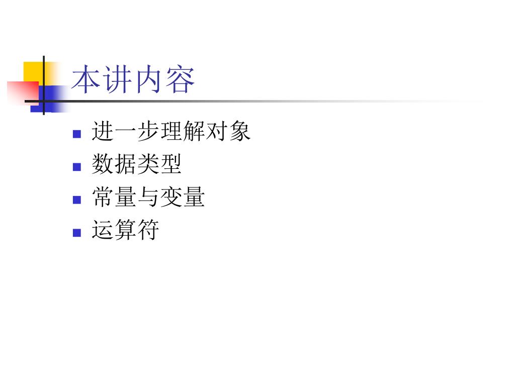 本讲内容 • 进一步理解对象 • 数据类型 • 常量与变量 • 运算符