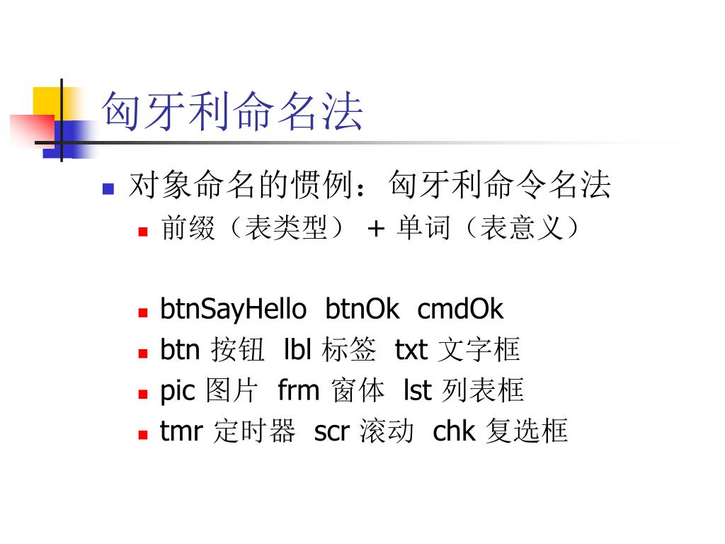 匈牙利命名法 • 对象命名的惯例:匈牙利命令名法 • 前缀(表类型) + 单词(表意义) • btnSayHello btnOk cmdOk • btn 按钮 lbl 标签 txt 文字框 • pic 图片 frm 窗体 lst 列表框 • tmr 定时器 scr 滚动 chk 复选框