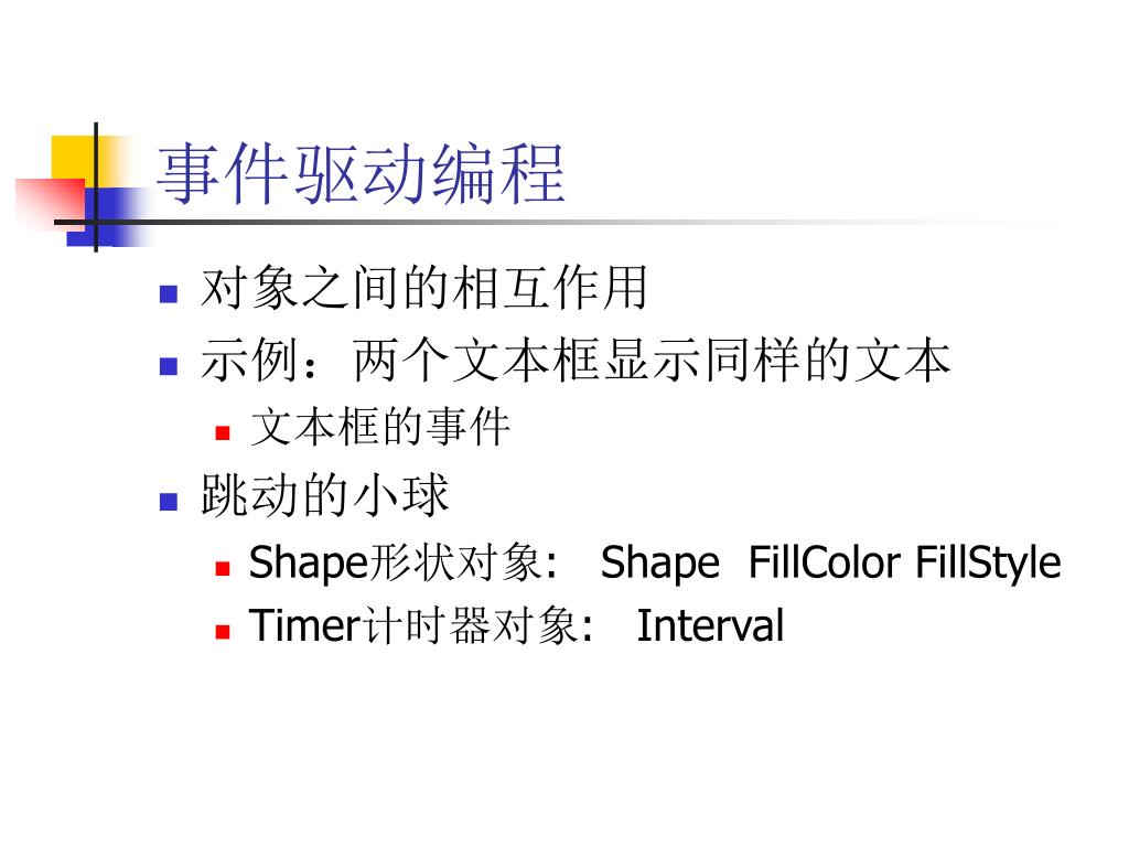 事件驱动编程 • 对象之间的相互作用 • 示例:两个文本框显示同样的文本 • 文本框的事件 • 跳动的小球 • Shape形状对象: Shape FillColor FillStyle • Timer计时器对象: Interval