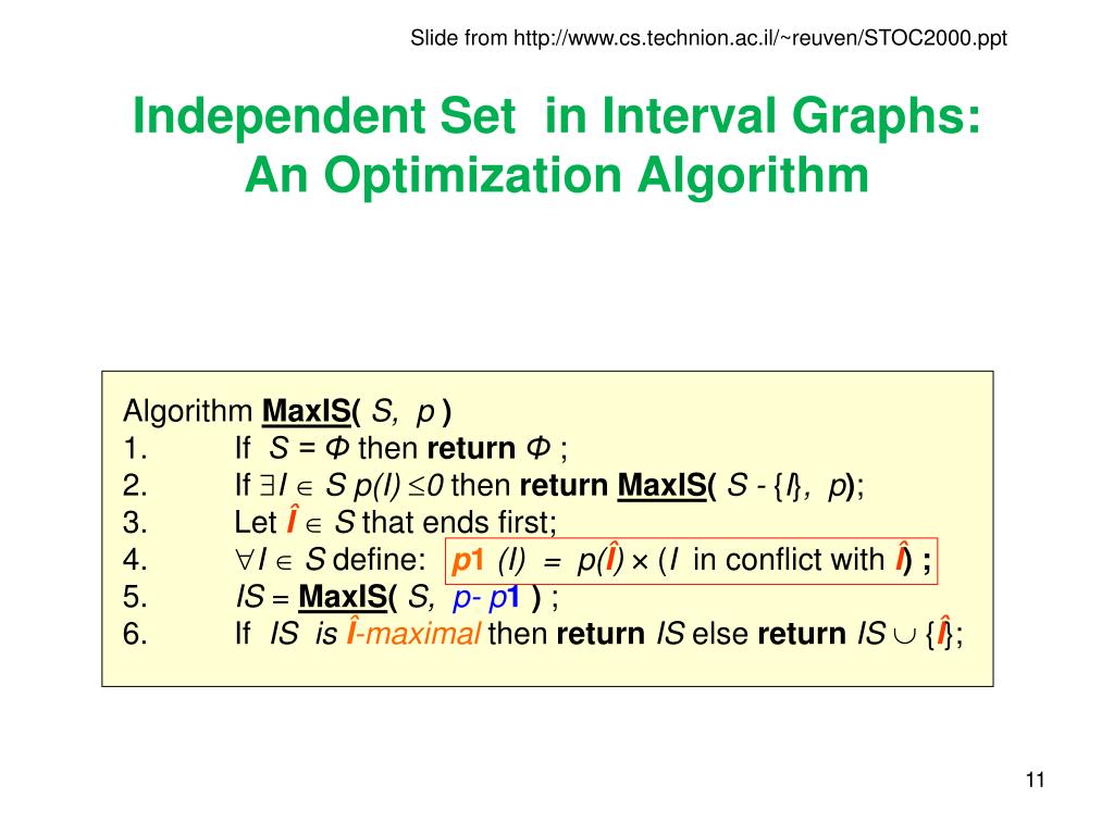 Slide from http://www.cs.technion.ac.il/~reuven/STOC2000.ppt Independent Set in Interval Graphs:An Optimization Algorithm • Algorithm MaxIS( S, p ) • If S = Φ then returnΦ ; • If ISp(I) 0 then returnMaxIS( S - {I}, p); • Let ÎS that ends first; • IS define: p1(I) = p(Î) (I in conflict with Î) ; • IS = MaxIS( S, p- p1) ; • If IS is Î-maximal then returnIS else return IS {Î};