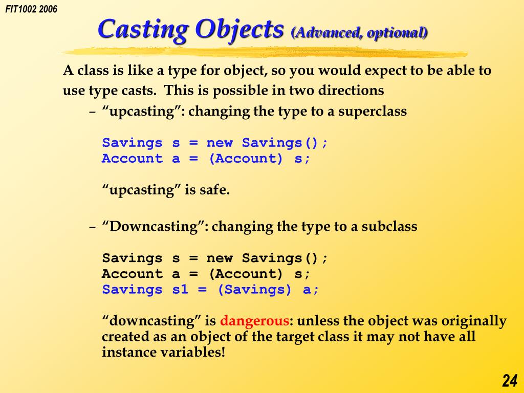 Casting Objects (Advanced, optional) • A class is like a type for object, so you would expect to be able to • use type casts. This is possible in two directions • “upcasting”: changing the type to a superclassSavings s = new Savings();Account a = (Account) s;“upcasting” is safe. • “Downcasting”: changing the type to a subclassSavings s = new Savings();Account a = (Account) s;Savings s1 = (Savings) a;“downcasting” is dangerous: unless the object was originally created as an object of the target class it may not have all instance variables!