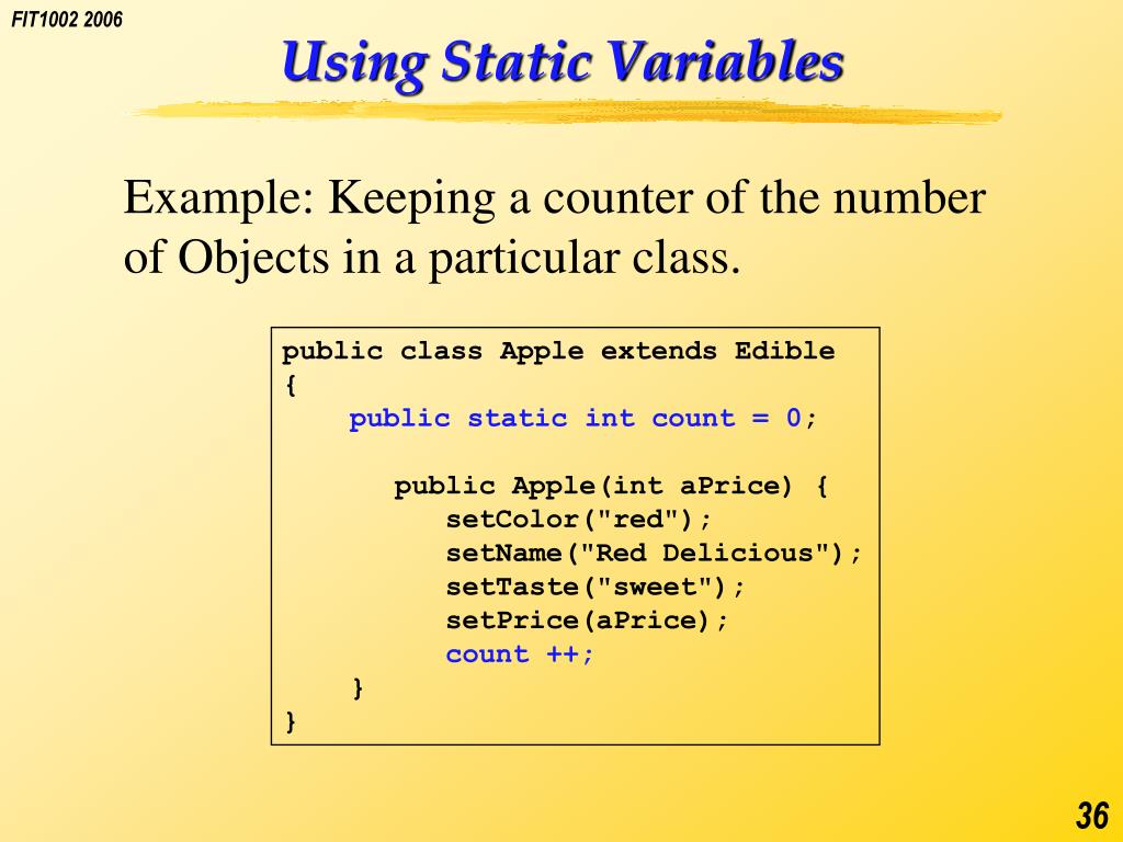 Using Static Variables Example: Keeping a counter of the number of Objects in a particular class. public class Apple extends Edible { public static int count = 0; public Apple(int aPrice) { setColor("red"); setName("Red Delicious"); setTaste("sweet"); setPrice(aPrice); count ++; } }